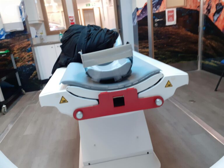 This CT bed has an adjustable bed bracket with a top brace and end stop, the headrest may have to be removed to fit the end stop, these should be in place when in transit and removed when setup.