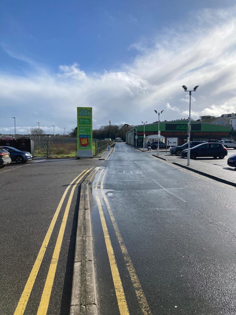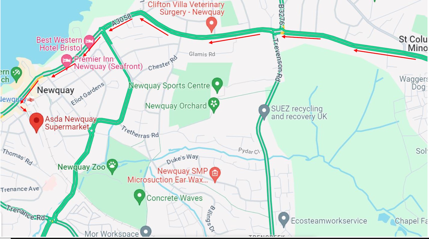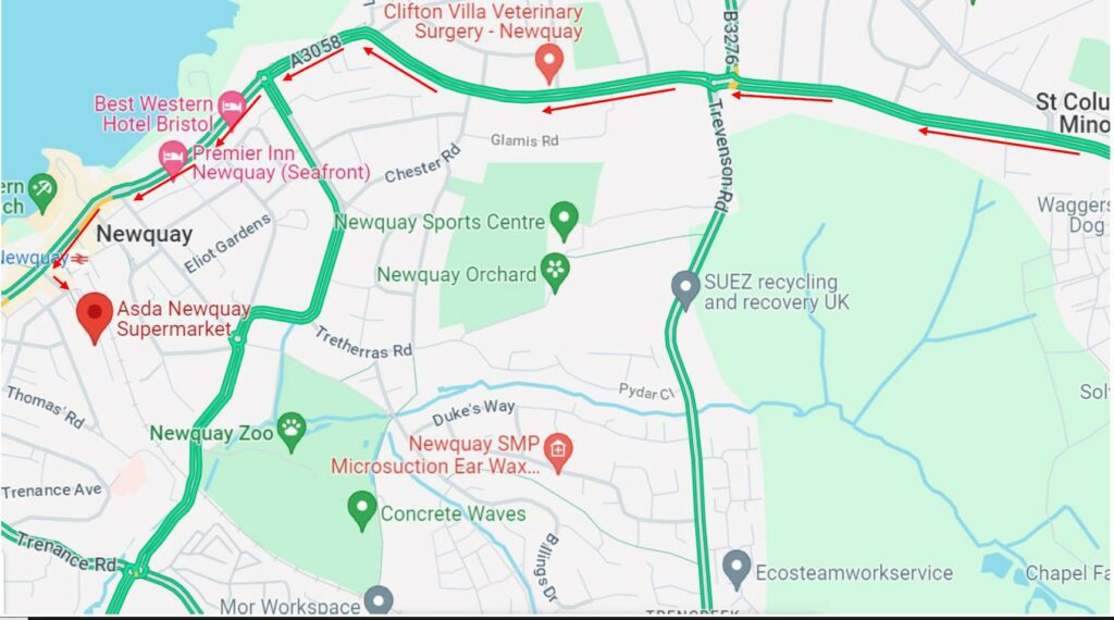 A392, right onto A3058 (North Way) stay on A3058 to the sea front. Follow Cliff road with the sea on your right, Asda will be on your left after the train station.