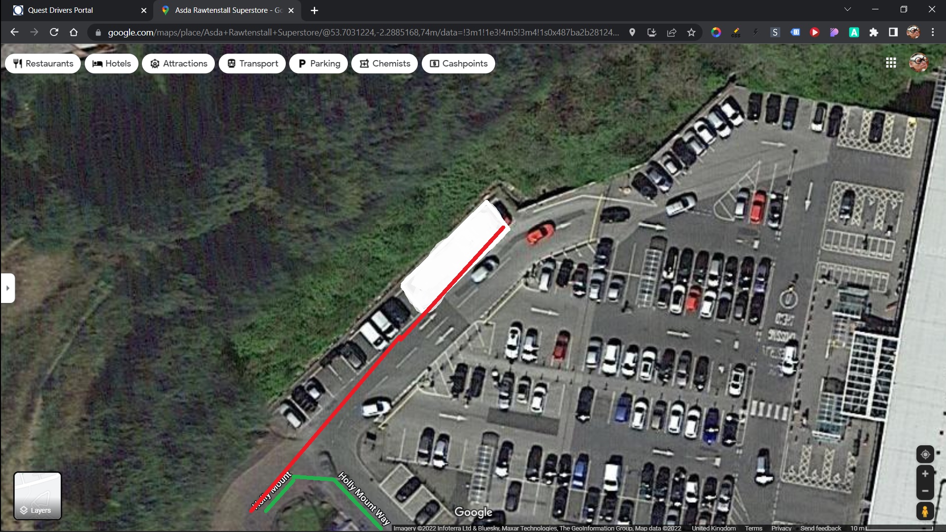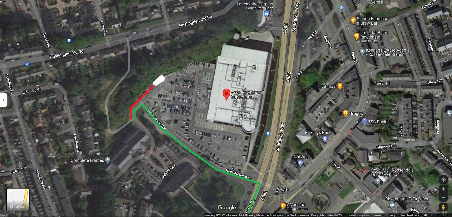 A56, A682 Asda will be on your left in the town centre, turn left at the lights and go up the ramp onto the top level. see pictures for the pad location.
