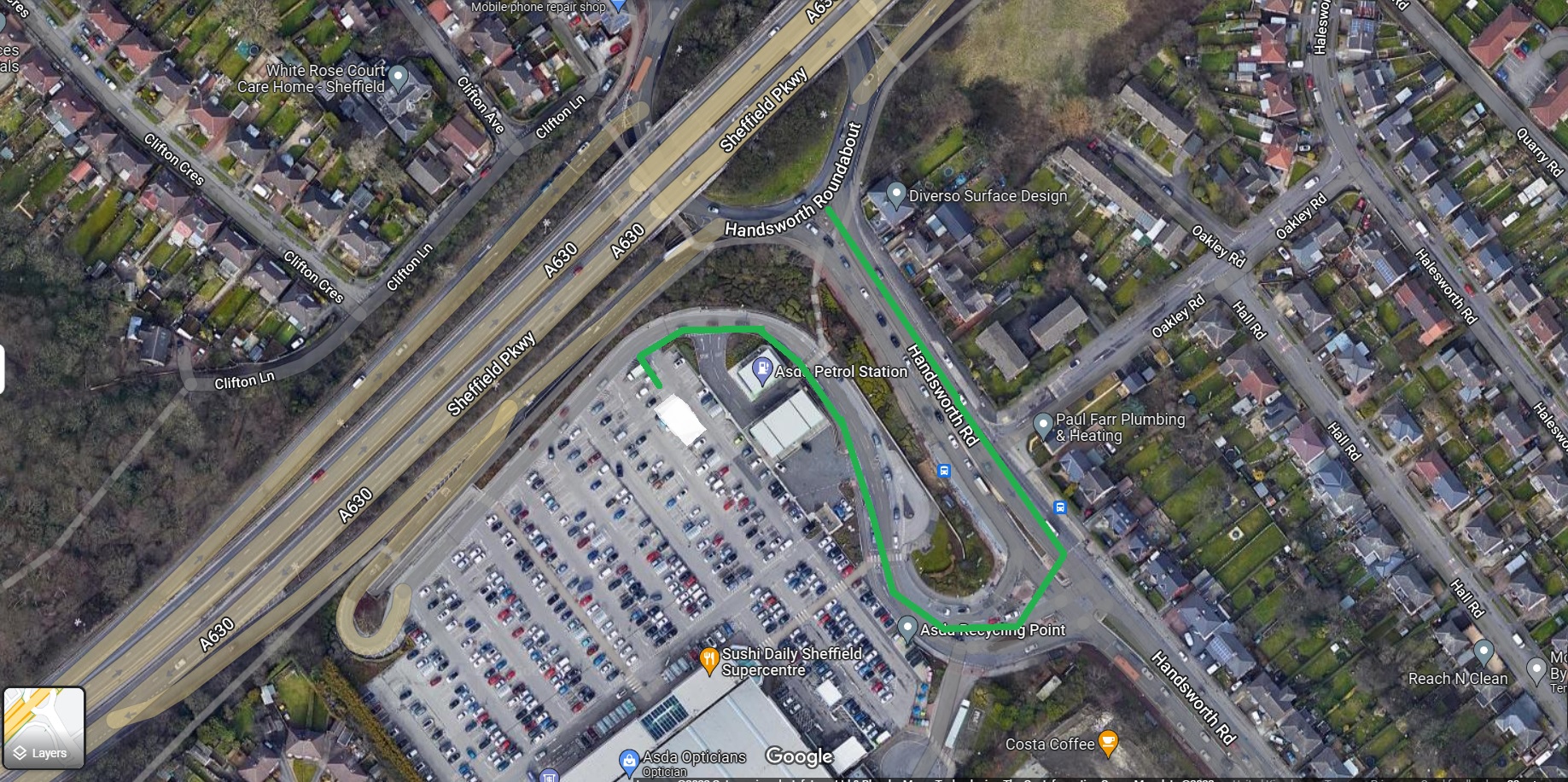 Best Approach: M1 J33, take A630 towards Sheffield (Sheffield Parkway). Take the exit for Handsworth (B6200), asda will be on your right, use main entrance past the garage.