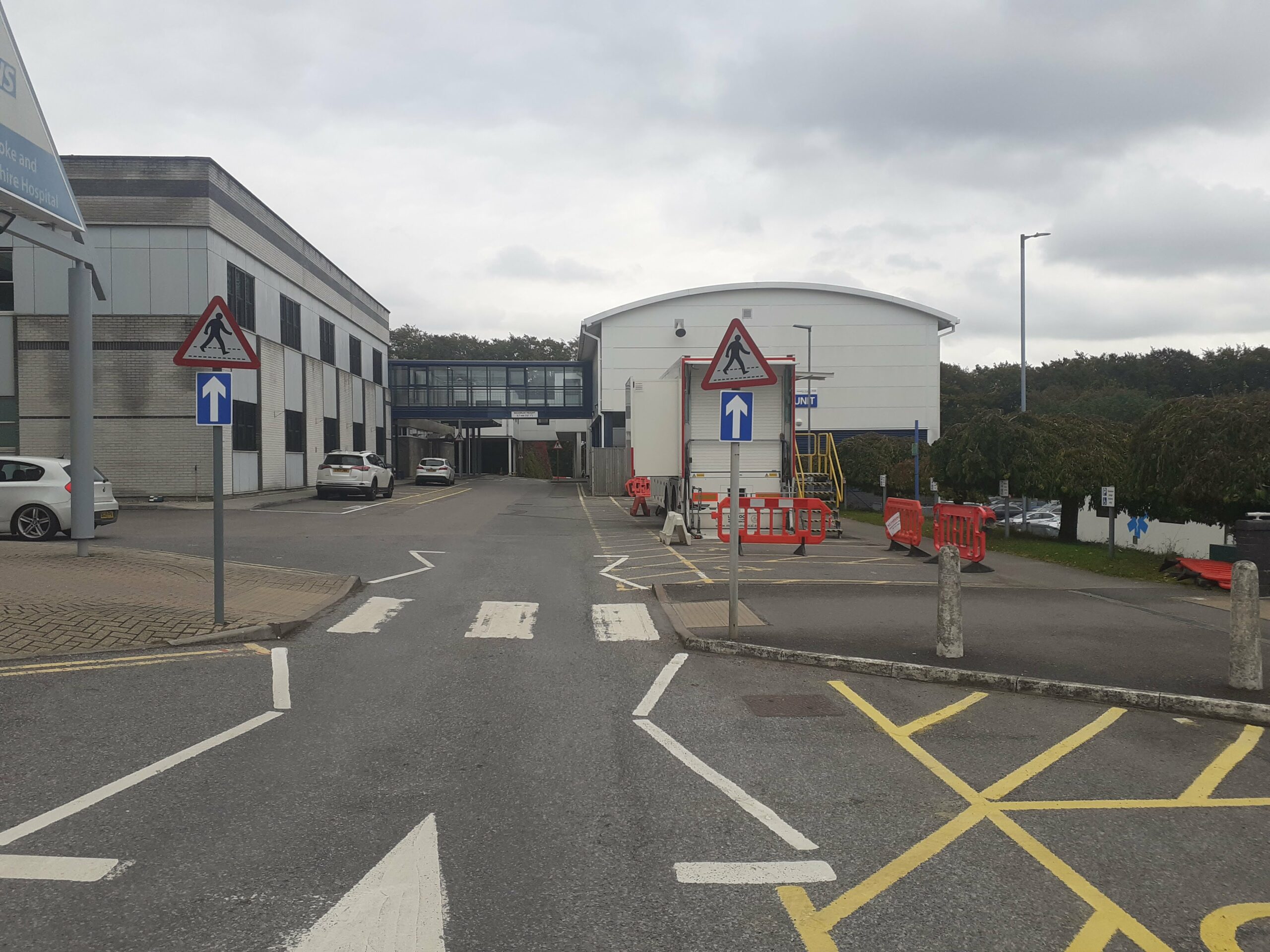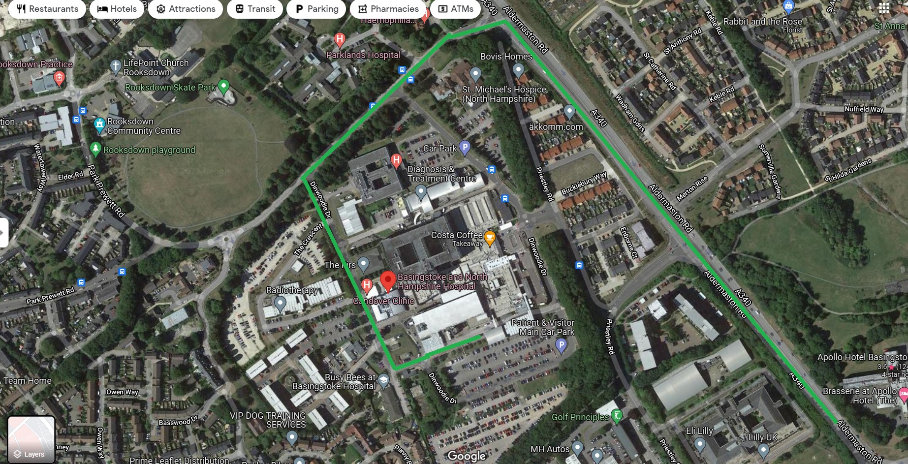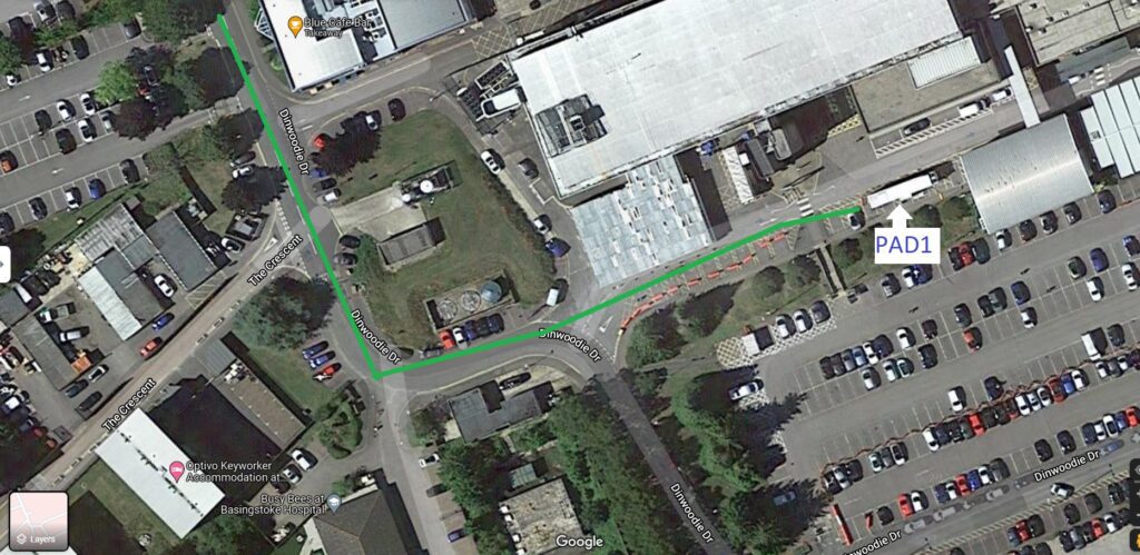 M3 JCT6 see maps, use Parklands Hospital entrance off Aldermaston road, then take 2nd left into Dinwoodie Drive, proceed through no entry gate, see photos, keep left into the large car park, go through the zebra crossing, pad 1 is on the right outside the MRI suite.