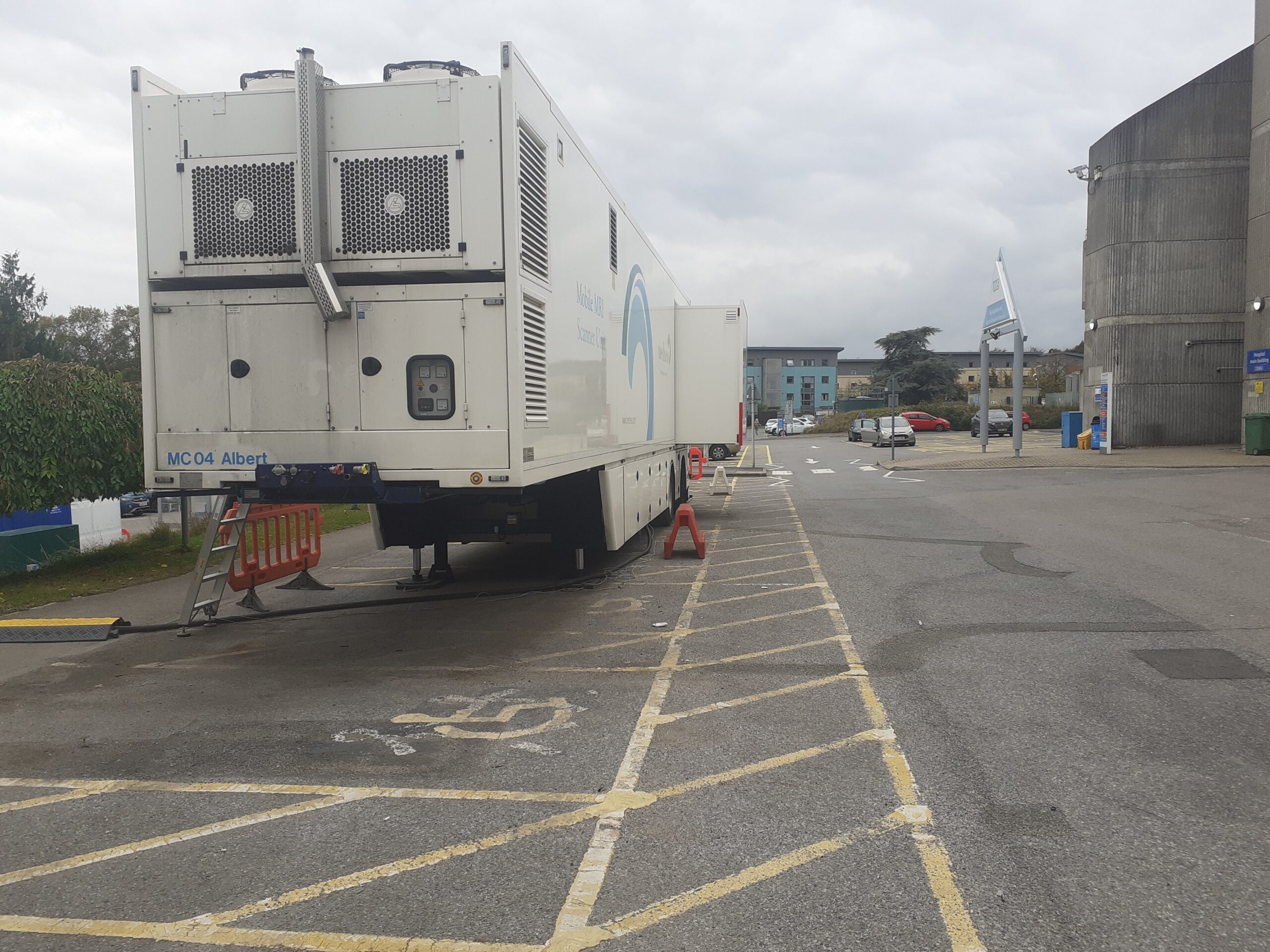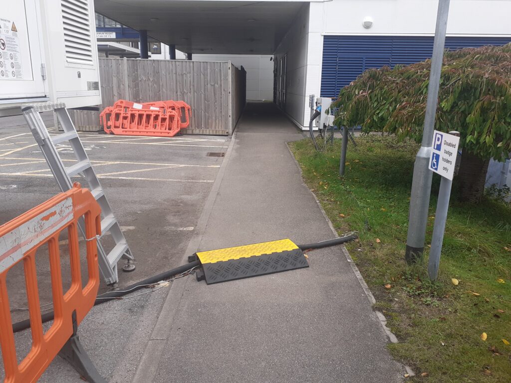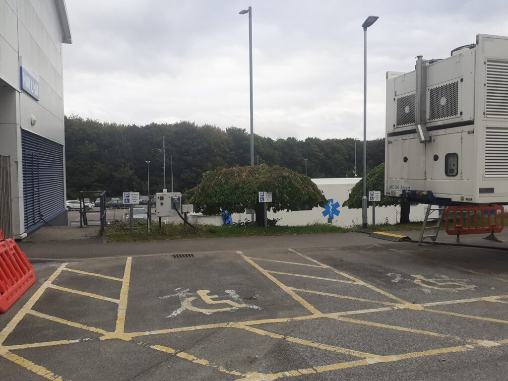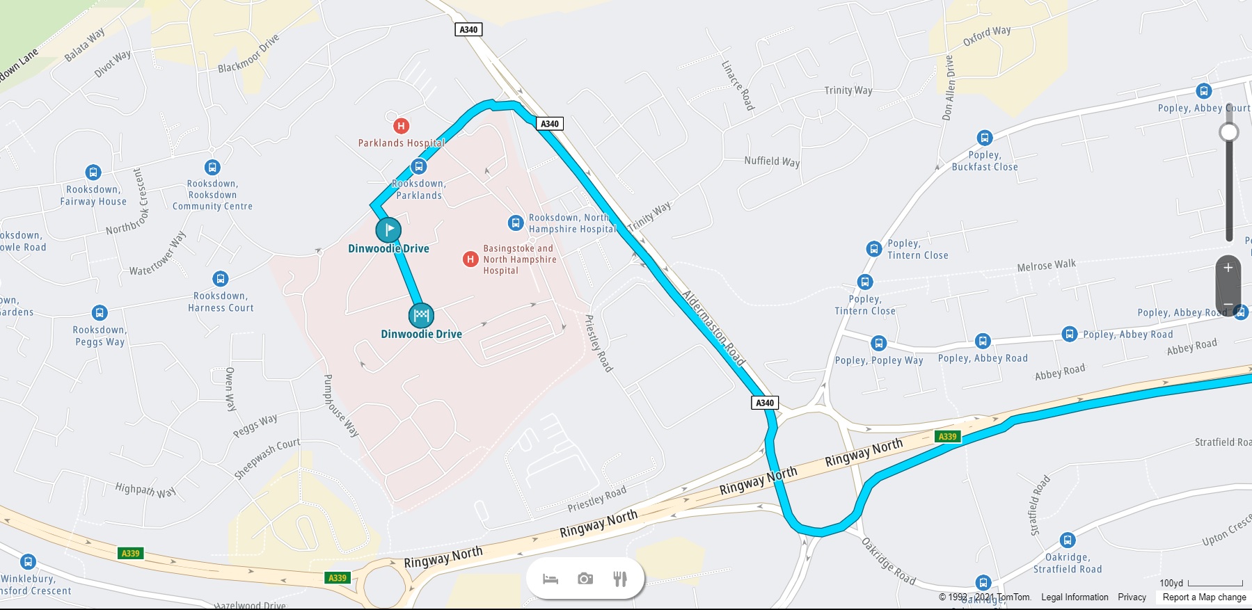M3 JCT6 see maps, use Parklands Hospital entrance off Aldermaston road, then take 2nd left into Dinwoodie Drive, proceed through no entry gate, see photos, keep left into the large car park, go through the zebra crossing, pad 1 is on the right outside the MRI suite.