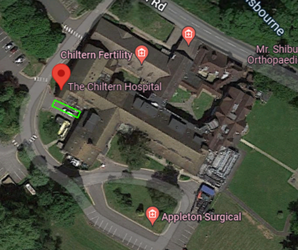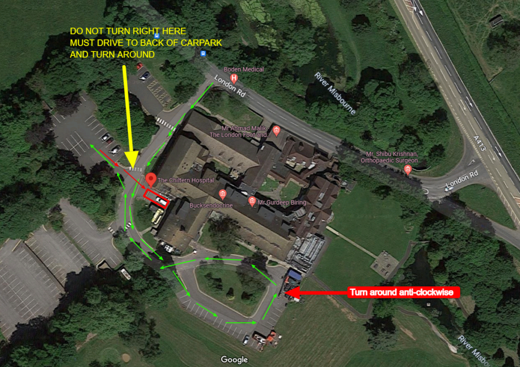 From M40 at J2 Roundabout turn right signed Amersham. Next roundabout turn left onto A40 signed Amersham. Mini round about, turn right. Go 5 miles to round about turn left onto A413 signed Aylesbury. Next round about right signed Aylesbury next round about straight on (lay by on left for overnight parking) Follow A413 dual carriageway past garage, past Deepmill diner on left, under bridge turn left signed Little & Great Kingshill, Hospital on left.