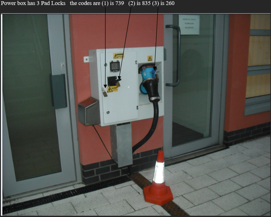 Power cabinet code: Pad Lock Codes (1) is 739 (2) is 835 (3) is 260