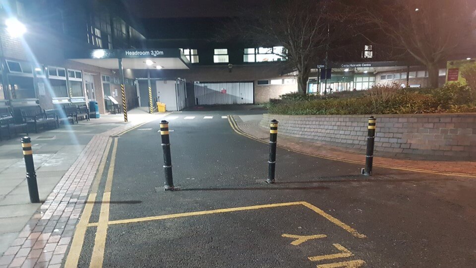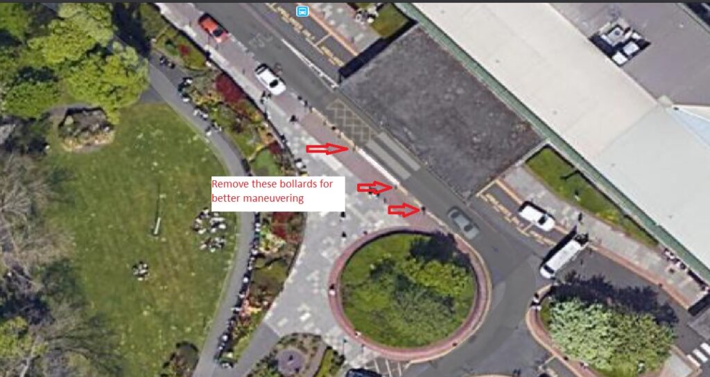 Site Notes: Remove bollards in front of main canopy to give more manoeuvring room. See picture.
