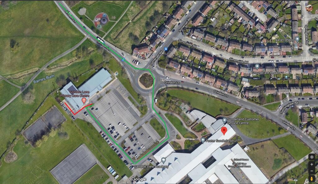 A19 Then A183 Towards Sunderland at 3rd roundabout turn right onto Grindon Lane, the hospital will be on your right.