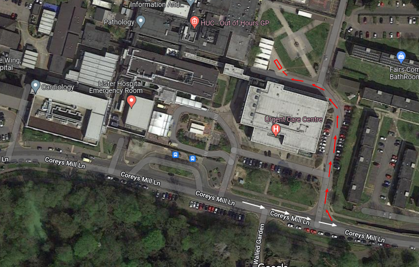 Best Approach: COME OFF A1(M) AT JUNCTION 8 HEAD ON A602 TOWARDS STEVENAGE TO ISLAND 1ST EXIT INTO COREYS MILL LANE HOSPITAL ON LEFT