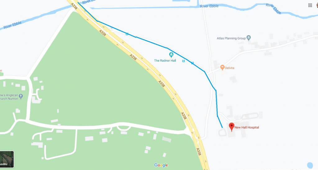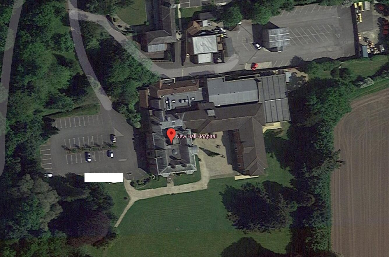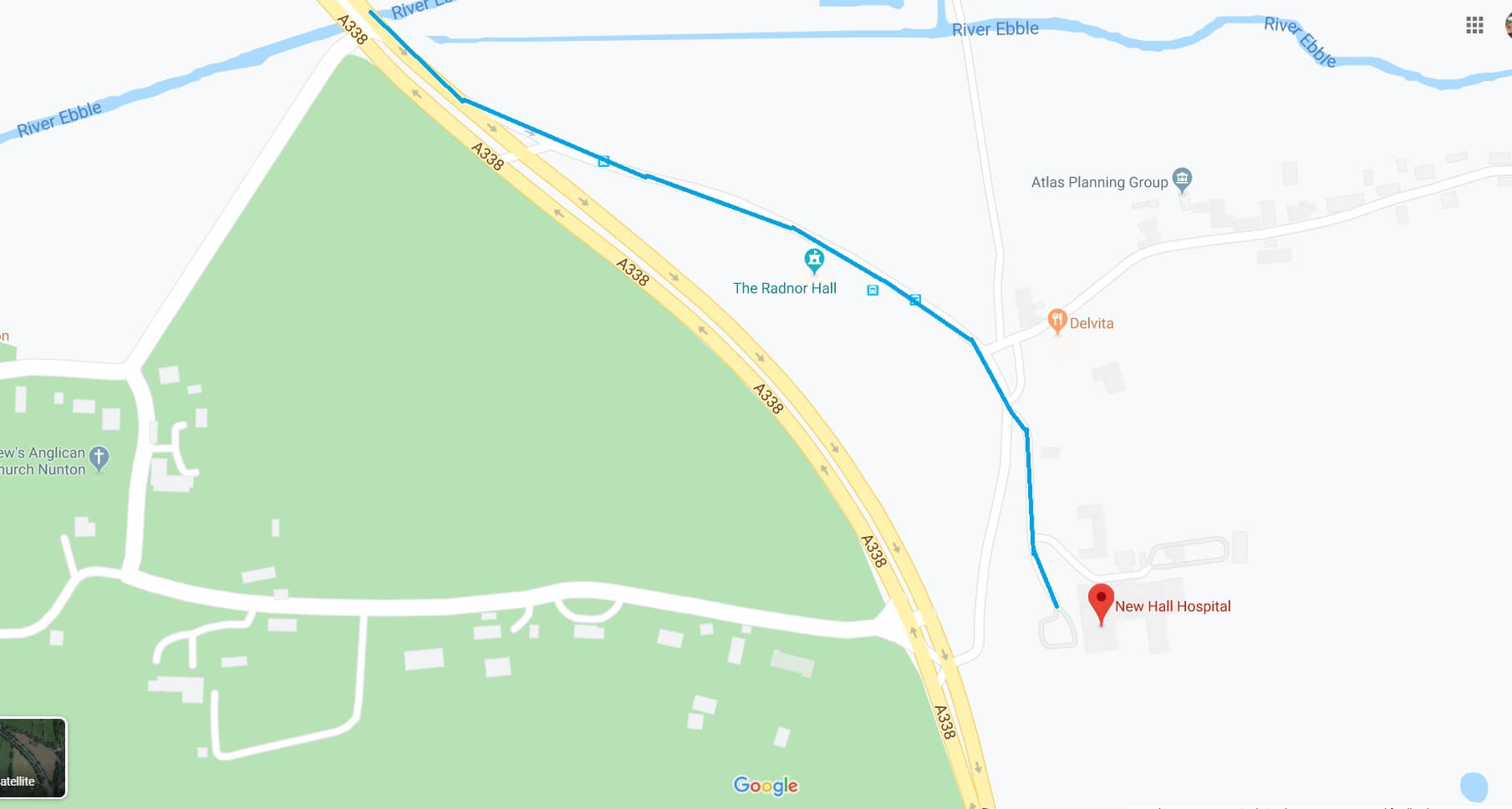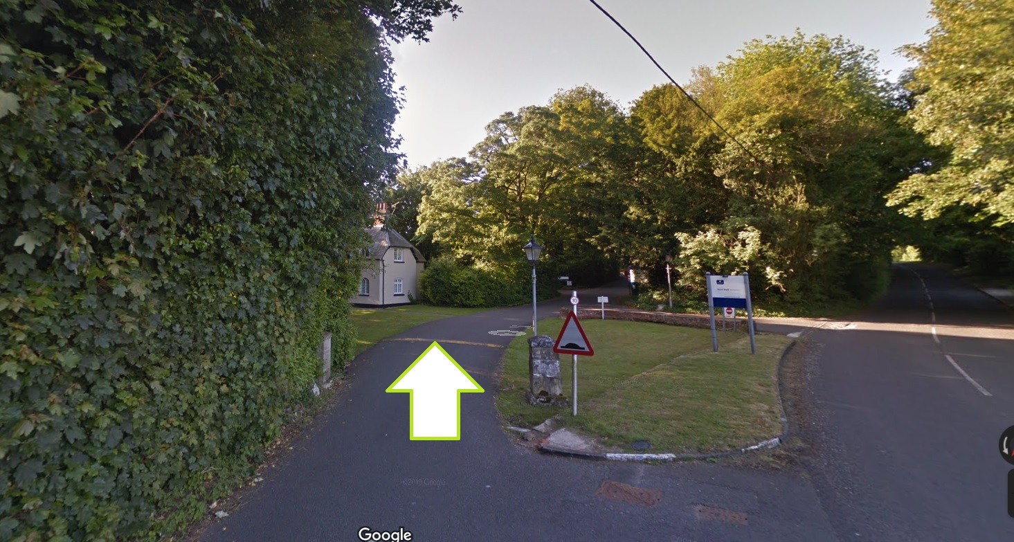 Be aware of narrow lane to hospital, see Picture of slip road off A338 Overhanging branches on narrow drive. Go between white stone posts to hospital, see pic.