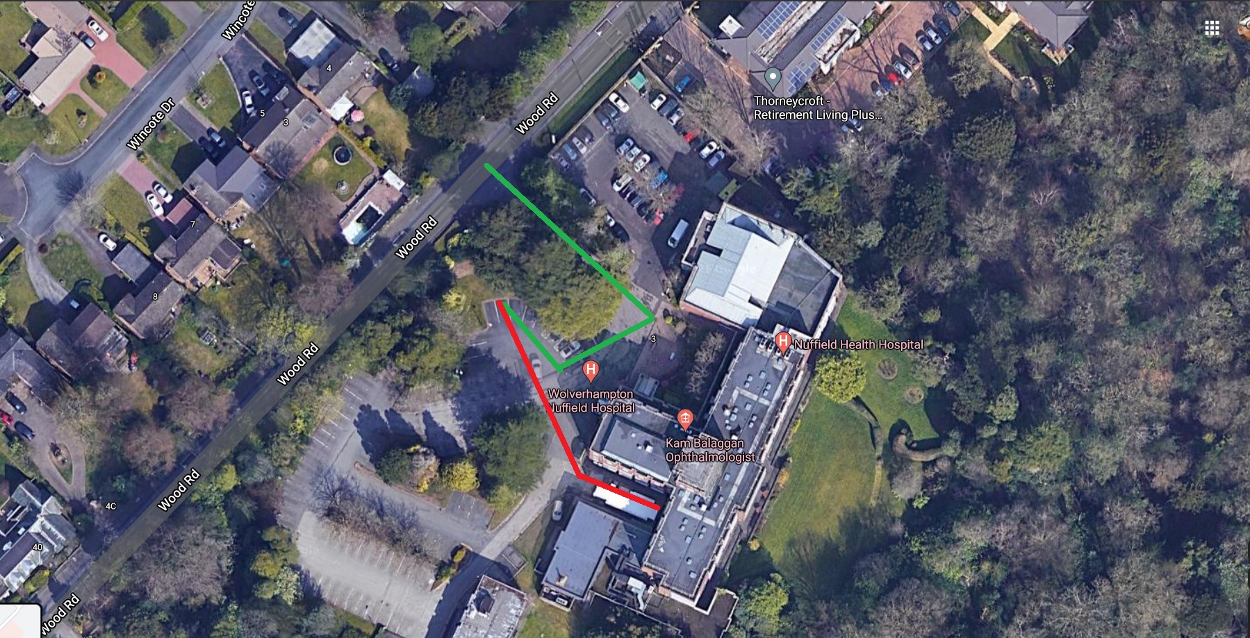 Approach from A41, turn onto Upper Green, this is a sharp turn. take first left to continue on Upper Green then High Street, follow the road around to the right onto wood road. In about half a mile the hospital will entrance will be on your left.