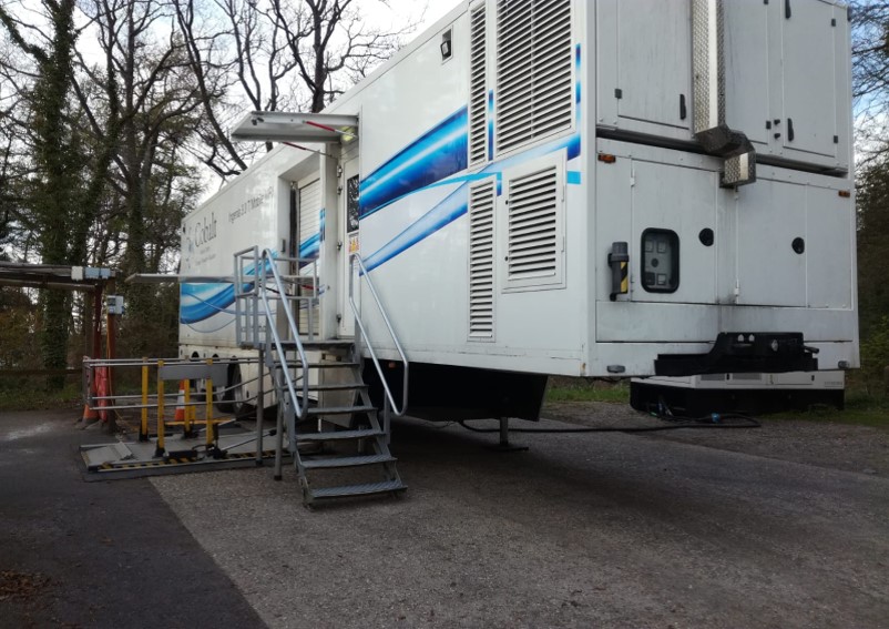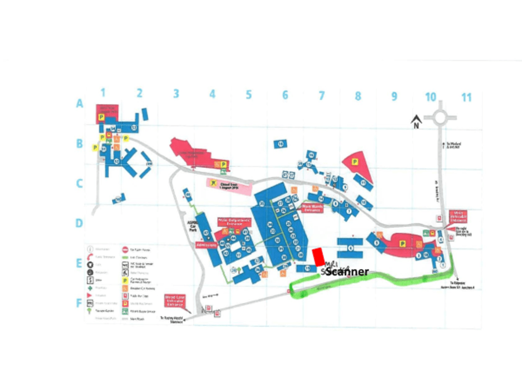 The entrance for the scanner is in Wood Lane do not drive in main entrance. Go past main entrance and take first right, Wood Lane, about half mile down there are gates on the right. Phone security to open the gates half hour before arriving 0208 909 5876. Once through the gates turn left and then reverse back through the swing barrier, Code 1401 .The security should see you in. Then reverse round the corner to your offside where the pad is.