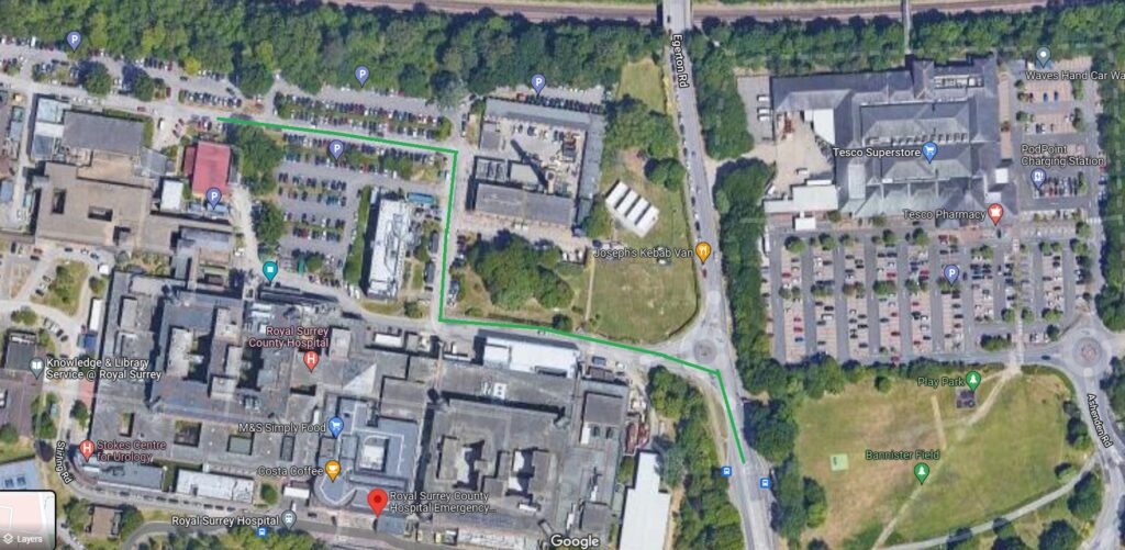 From A3, follow signs for Hospital, onto Egerton Road, at the lights Turn right onto Egerton Road, at the roundabout turn left into the hospital take the next right down the hill past the boiler house, follow the road to the left, the lay-by will be on your left (see photos) turn around, steps are towards grass verge.