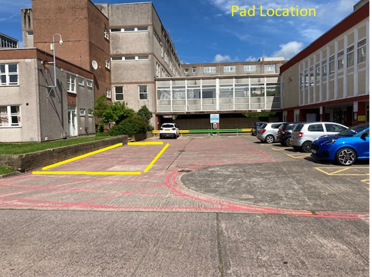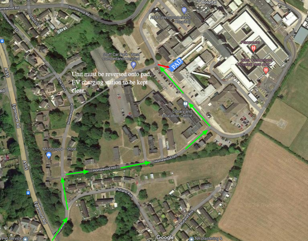The unit must enter and exit the hospital via Rutland Ave, main entrance not suitable for unit. Head south on A595, turn left on to Rutland Avenue follow the road round (keep left), turn right onto Honeywood Hill follow down to the end and turn left into the hospital. Follow the road down and on your right you will see a small car park with EV charging facilities.