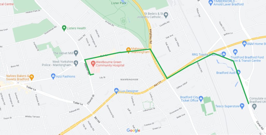 The best approach is from Manningham Lane then left onto Oak Lane, at the second set of traffic lights turn left onto Heaton road, in a quarter of a mile the entrance will be on your left.