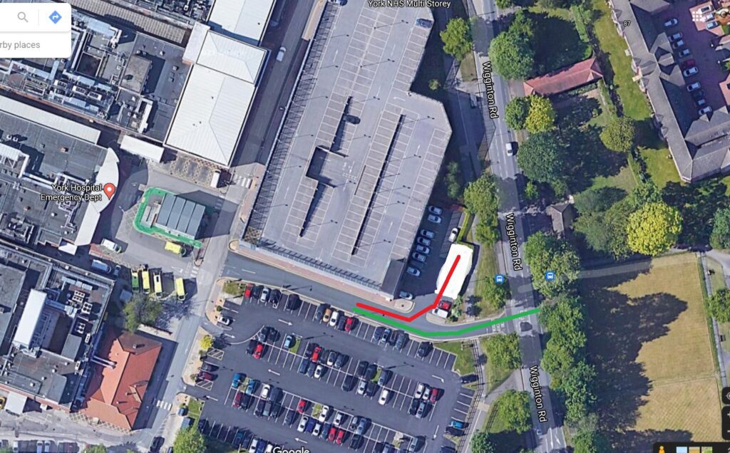 Site is located on Wigginton Road, the best route in from A1237 (York Ring Road). With hospital on the right drive over 2 mini roundabouts (entrance 1 and 2 to hospital) and then turn right into the site, signed Emergency Vehicles and Authorised Buses only (see pic)